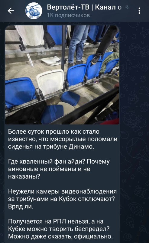 Динамовские фан-айдишники из имбецильного сообщества "Вертолет ТВ" продолжают поставлять нам контент. После кубкового дерби со "Спартаком" они: • Требуют покарать фанатов "Спартака" за сломанные стул