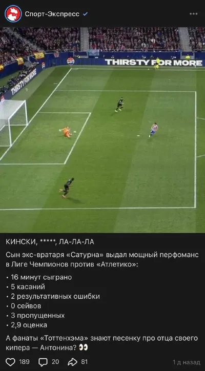 "Спорт-Экспресс" поглумился над вратарем "Тоттенхэма" Антонином Кински, который пропустил три гола от "Атлетико" и был заменен уже на 17-й минуте. Официальный телеграм-канал газеты с петухом на эмбл
