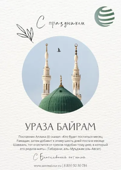 ✨ Поздравляем с праздником Ураза-Байрам! ✨ Ид аль-Фитр — это день радости, благодарности и принятия поклонения. Пусть Аллах примет ваш пост, дуа и все благие дела, совершённые в Рамадан. Пусть этот