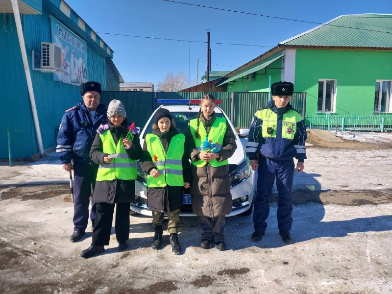 В Акше в праздничный день🚔 Госавтоинспекция межмуниципального отдела полиции и школьники из отряда ЮИД порадовали автоледи поздравлениями прямо на дороге 👮♂️Инспекторы ДПС останавливали женщин за