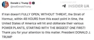 ❗️Трамп угрожает уничтожить электростанции Ирана, если Ормузский пролив не откроют в течение 48 часов Также он заявил, что не заинтересован в сделке с Тегераном, назвав иранское руководство «мертвым»