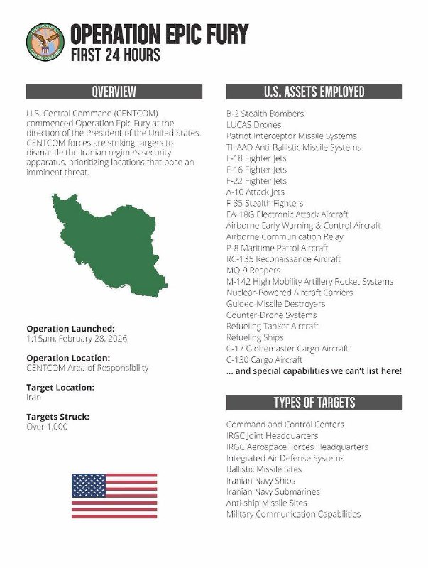 За первые 24 часа операции "Эпическая ярость" по всему Ирану было поражено более 1000 целей, - Центральное командование США