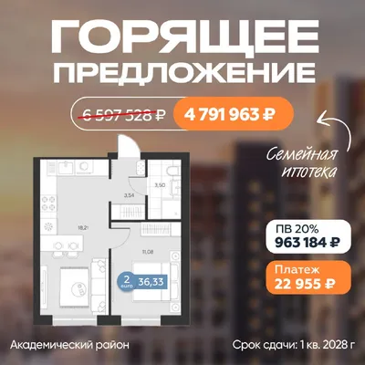 🔥 КВАРТИРА С ПЛАТЕЖОМ НИЖЕ АРЕНДЫ И ПВ ДО МИЛЛИОНА 🔥🔥🔥🔥🔥🔥🔥🔥🔥🔥 Евро-2 с предчистовой отделкой за 4 791 963₽ 💰💰 963 184 ₽ 💎💎💎💎 22 955 ₽/мес Срок сдачи — 1 квартал 2028 📍Академичес