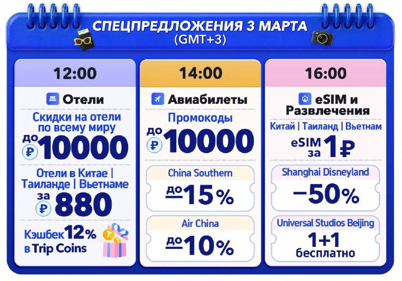 Распродажа 3.3 от Trip С 3 марта по 6 марта на Trip.com стартует весенняя распродажа. Обещают скидки на авиабилеты и отели. Авиабилеты — купоны на скидку 50% (максимально 10 000 ₽). Отели — купоны