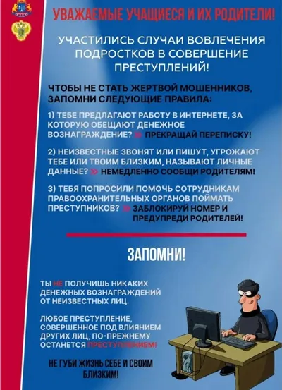 🚨 ВНИМАНИЕ: ПОДРОСТКОВ ВОВЛЕКАЮТ В СОВЕРШЕНИЕ ПРЕСТУПЛЕНИЙ! 🚨 В последнее время участились случаи, когда мошенники пытаются вовлечь несовершеннолетних в противоправную деятельность. Правоохранитель
