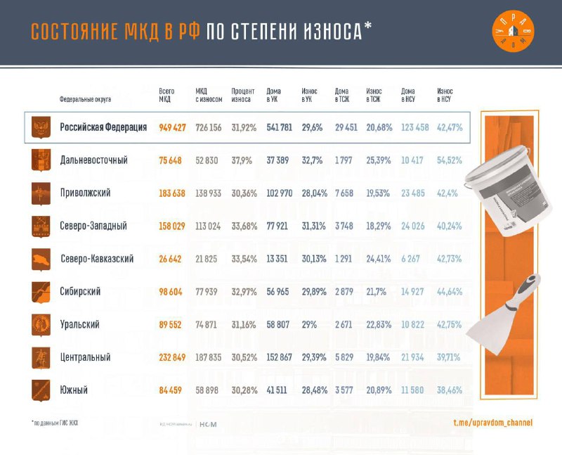 Состояние МКД напрямую связано со способом управления. В среднем по стране износ МКД составляет 31,92%. Но показатель заметно различается по формам управления. 🏬 Самое плохое состояние у домов на н