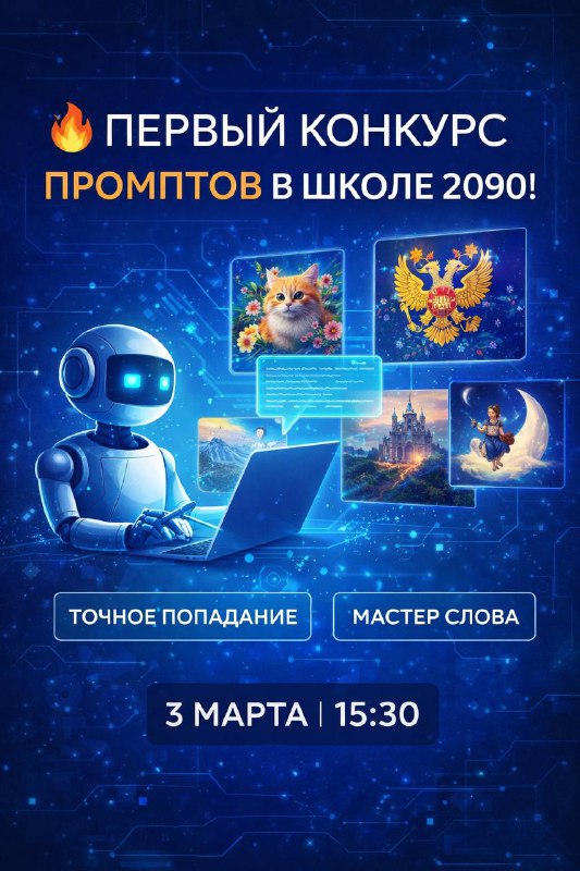 🔥 Первый конкурс промптов в школе 2090! 3 марта в 15:30 Конференц-зал корпуса №3 Впервые мы проводим конкурс, где главным инструментом станет не кисть и не камера, а слово. Это соревнование для тех