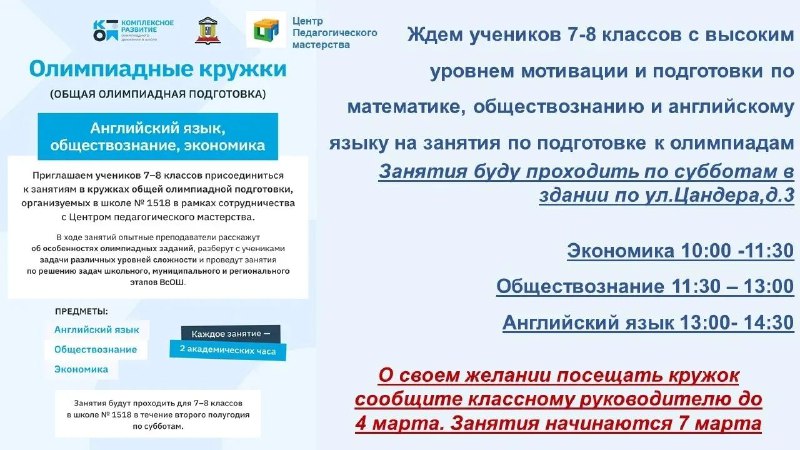 ❗️Напоминаем, что сегодня - 4 марта! 🎓 А это значит, что именно сегодня заканчивается запись учеников 7-8 классов в объединения дополнительного образования по математике, обществознанию и английско