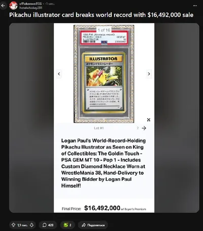 На Reddit нашли обсуждение карты Pikachu Illustrator — одного из самых редких и желанных лотов в истории Pokémon. Экземпляр с оценкой PSA 10 недавно ушел с аукциона за $16,492,000 и поставил мировой р