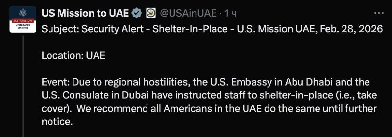 ⚡️🇺🇸 Посольства США в ОАЭ, Катаре, Кувейте, Бахрейне, Израиле, Иордании ввели режим укрытия для персонала (shelter-in-place) до дальнейшего уведомления. Возможны отмены собеседований! Проверяйте по