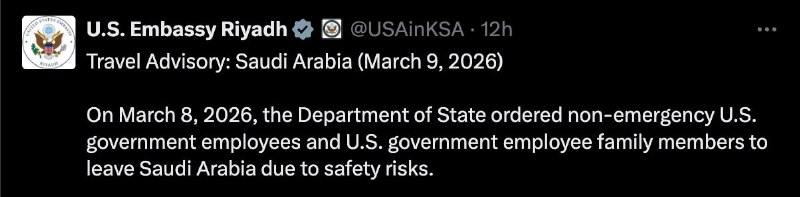 🇺🇸🇸🇦 Сотрудникам посольства США в Саудовской Аравии приказали покинуть страну в соответствии с решением Госдепартамента. На данный момент посольства и консульские отделы США в Иордании, Ливане, К