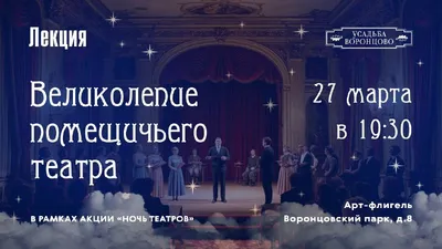 Дайджест событий на ближайшие три дня: 1️⃣ Ночь театров: лекция «Великолепие помещичьего театра» (16+) 📆 27 марта в 19:30 🗺Арт-флигель (Воронцовский парк, 8) 💳 Вход свободный, регистрация по ссылк