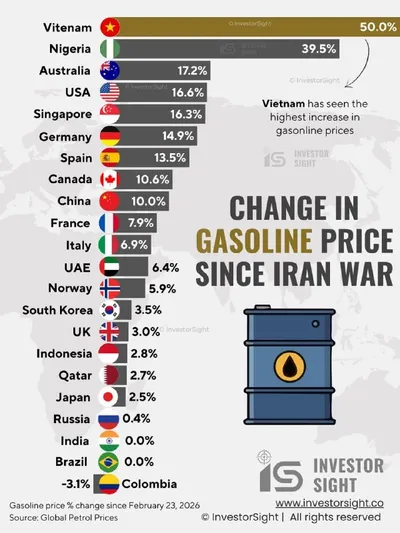 Цены на бензин по странам. Иран явно воюет эффективнее США 👍. Но самая большая головная боль цены на авиационный керосин - там рост еще больше. Мировая экономика испытывает шок. Подписаться на @