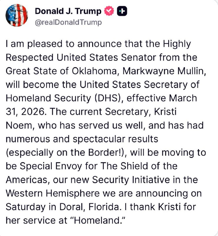 ❗️❗️❗️❗️ Президент Трамп принял решение об увольнении секретаря внутренней безопасности Кристи Ноэм. На ее место с 31 марта будет назначен сенатор от Оклахомы Markwayne Mullin.