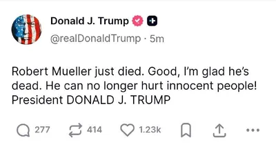 Президент Трамп выразил сочувствие в связи со смертью бывшего директора ФБР и специального прокурора Роберта Мюллера: "Роберт Мюллер только что умер. Хорошо, я рад, что он мёртв. Он больше не может п