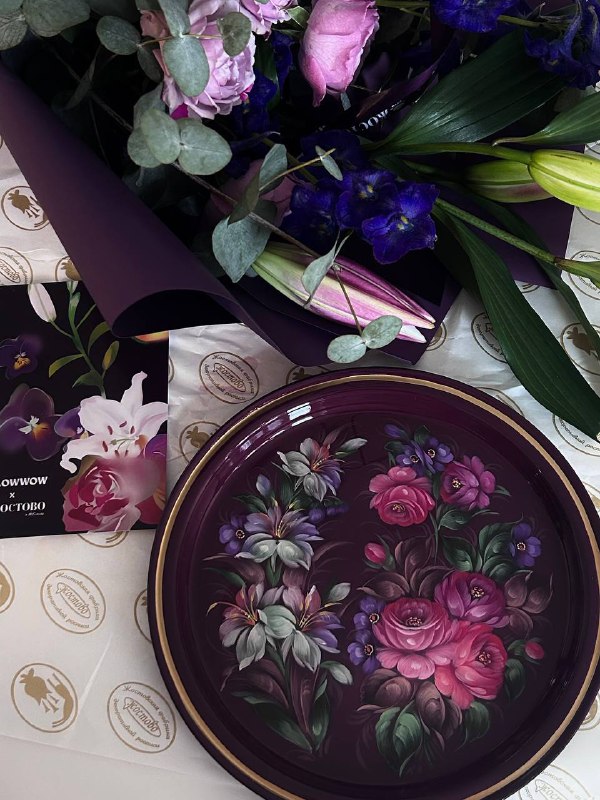 Смотрите, какая красота мне пришла! 🌸 К Международному женскому дню Flowwow и Жостовская фабрика запустили чудесную коллаборацию — подарочные наборы с букетами и жостовскими подносами ручной росписи