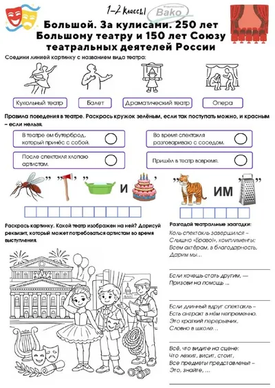 🩰 Рабочие листы по теме «Большой. За кулисами. 250 лет Большому театру и 150 лет Союзу театральных деятелей России» Сегодня вы можете скачать: 🔅 Рабочий лист для 1-2 классов 🔅 Рабочий лист для 3