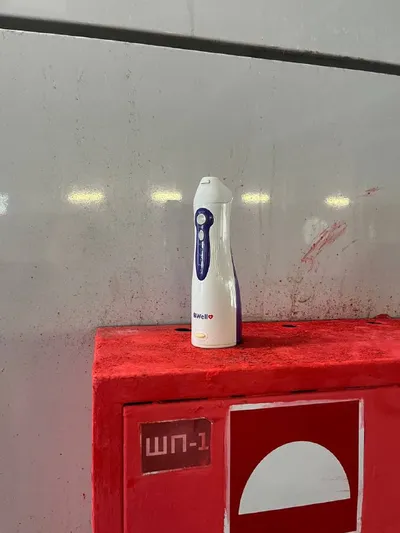 🪥Выхожу из метро. Смотрю на пожарном щитке что-то знакомое. Подхожу, а это ирригатор. Как он там оказаться? Возможно сбежал от неряшливого хозяина, который на него забил.