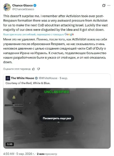 Activision пыталась заставить разработчиков Call of Duty сделать игру о вторжении Ирана в Израиль — об этом рассказал один из сооснователей Infinity Ward По словам аниматора Ченса Гласко, ситуация пр