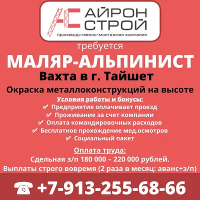 🔷🔸🔷 ТРЕБУЕТСЯ МАЛЯР-АЛЬПИНИСТ 🔷🔸🔷 📍 Место работы: Вахта в г. Тайшет 🏗 Обязанности: Окраска металлоконструкций на высоте. 🎁 Условия работы и бонусы: ✅ Предприятие оплачивает проезд ✅ Прожива
