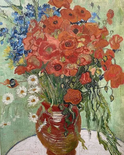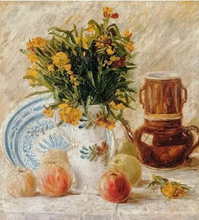 Ваза с цветами, кофейник и фрукты, 1887 Этот цветочный натюрморт был создан в период с июля по сентябрь 1887 года, когда Винсент Ван Гог жил в Париже. Он переехал в квартиру на улице Лепик, принадлеж