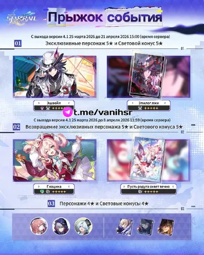 ✦ Дата и время выхода обновления 4.1 ✦ Первая половина 4.1 • 🧑 • Обновление и баннеры стартуют: • Все сервера • 25 марта в 06:00 по МСК • 💎 • Баннеры персонажей: • 🌟 • Всё обновление: [25 м
