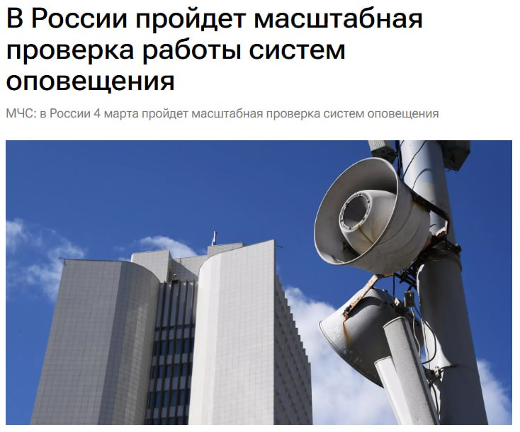 По всей России завоют СИРЕНЫ — 4 марта МЧС проведёт плановую проверку систем оповещения во всех регионах. Громкоговорители будут орать с 10 утра до 12 часов дня. Паниковать не стоит — опасности нет.