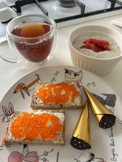 Доброе утро☀️ Завтрак мой. Не особо люблю я кашу овсяную, но пока мне надо есть кашки😊 С перетертой замороженной клубникой это даже вкусно весьма😊 В морозилке откопала заначку из замороженной икры а
