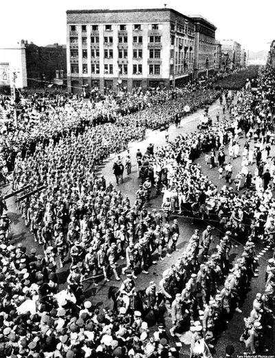 Колонна немецких военнопленных на улицах Москвы, 1944 год. Около 57000 немецких пленных маршировали по улицам города. А после, улицы тщательно вымыли - чтобы смыть все следы побежденных. @VeritasHis