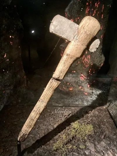 Редчайший экземпляр каменного топора с рукояткой из ясеня. Рукоятка тоже оригинальная - чудом, благодаря болотным условиям, она не сгнила. Возраст топорика - около 5200 лет назад, им пользовались в С