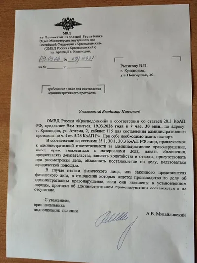 Сообщение от служителя церкви города Краснодон (ЛНР) Владимира Павловича Рытикова: "Сегодня в 12-00 принесли повестку явиться, сказали, для составления протокола, за проведение Богослужения без регис