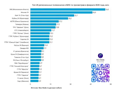 Вести Иркутск» в топ 25 региональных телеканалов в MAX по просмотрам за февраль 2026 года По относительному приросту просмотров к январю ГТРК «Иркутск» заняла пятое место с результатом +89%. Источн