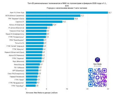 Вести‑Иркутск" вошли в топ‑25 региональных телеканалов по просмотрам в MAX Данные за февраль 2026 года, города с населением менее 1 млн человек ГТРК „Иркутск“ на 13‑м месте с результатом 6,6. Исто