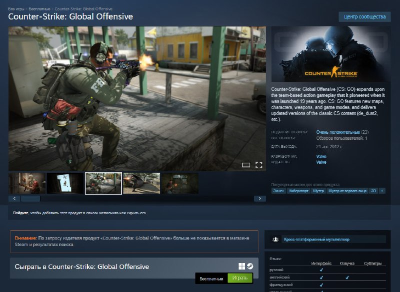 ⚡️ CS:GO вернулась в Steam — и её даже можно скачать Непонятно, чем вызвано возвращение игры в магазин, но она скачивается и запускается. Правда, никакого матчмейкинга (пока?) нет. Даёт только запу