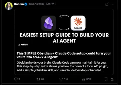 Не знаю насколько будет полезен этот мини-гайд, но всё же сама идея интересная. Суть в том, что можно сделать простую связку Obsidian + Claude Code —> превратить ваше хранилище (vault) в AI-агента, р