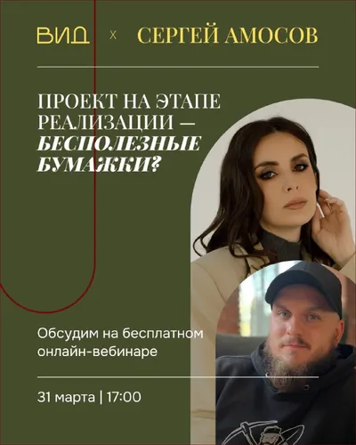 ОНЛАЙН-ВЕБИНАР Школа ВИД х Сергей Амосов 🗓31 марта в 17:00 мск Тема: «Проект на этапе реализации — бесполезные бумажки?» Что обсудим: 🟢 Почему проекты разрабатываются месяцами, а строители всё д