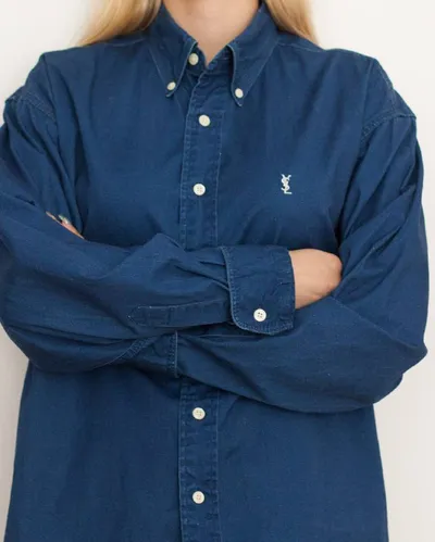 Джинсовая рубашка Yves Saint Laurent с логотипом бренда. Оригинал. Отличное состояние. Выполнена из 100 % хлопка. Сядет на размеры XS - M. Длина рубашки: 80 см. Длина рукава (от плечевого шва): 60 см.