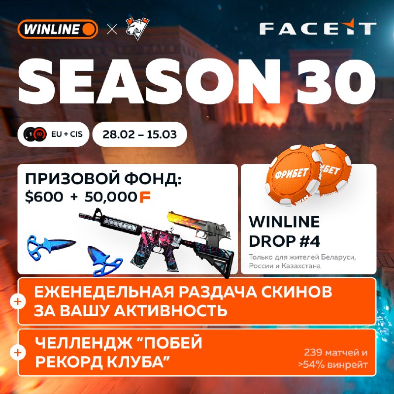 🔥 30-й юбилейный сезон клуба Virtus.pro на FACEIT стартовал! Включаемся на максимум, поднимаем скилл и разрываем сервера с усиленными призами от 🏆🏆🏆🏆 ✔️ Создавай матчи в клубе — https://fce.gg/