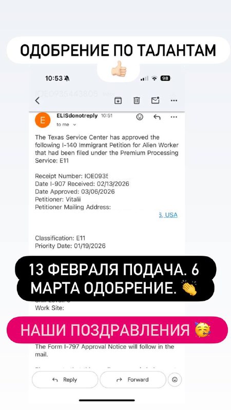 Новое одобрение. Новая победа. 🥇 Как видно из скрина. Подача была 13 февраля, сегодня пришло одобрение. Нет кризиса в иммиграции по талантам. Кейсы нужны сильные, и еще мотивация и желание работать