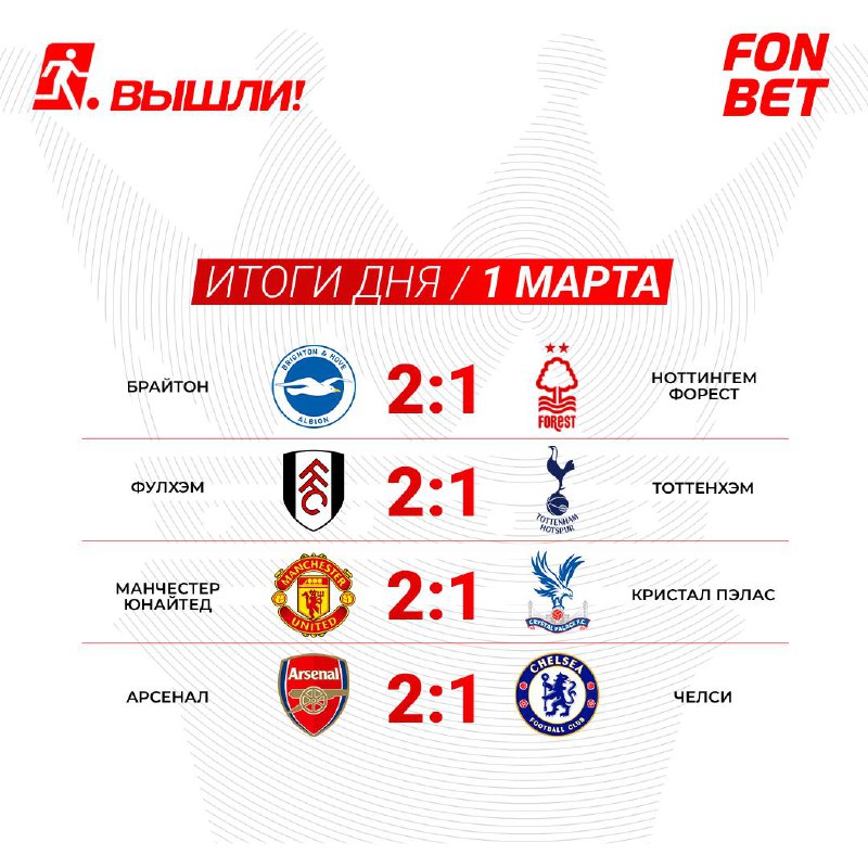 🗞️ Не видели ни матчей, ни хайлайтов? Тогда вот счёт и авторы мячей: «Брайтон» — «Ноттингем Форест» 2:1 Голы: Гомез 6', Уэлбек 15' — Гиббс-Уайт 13'. «Фулхэм» — «Тоттенхэм» 2:1 Голы: Уилсон 7', Иво
