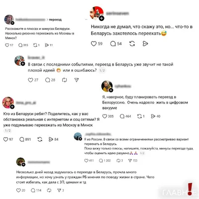⚡️ Россияне массово интересуются переездом в Беларусь На фоне блокировок интернета в России многие рассматривают Беларусь для ПМЖ. Обсуждаем эту новость в чате «Белорусы в России». Здесь более тысяч