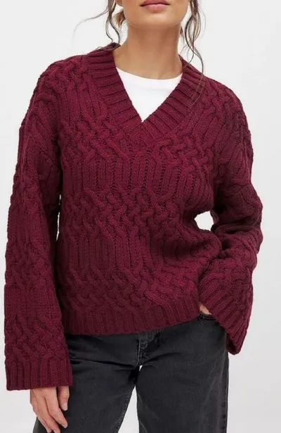 Пуловер с аранами.Глубокий бордо и сложный рельеф: V-образный вырез открывает дорогу графике из аранов. Классическая резинка и ажурная «плетёнка» сменяют друг друга блоками, образуя жёсткий, почти «ар