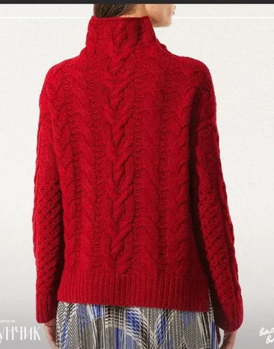 Свитер от Лоро Пьяна.Яркий цвет, необычный крой, лаконичный узор.По центру располагается сложное переплетение из перекрещивающихся петель, а по краям простые элементы. Расстояние между блоками лицевых