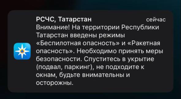 ❗️Режим «Ракетная опасность» объявили в Татарстане — МЧС. Также действует режим беспилотной опасности. Жителям советуют спуститься в укрытия. Присылайте нам новости через @VTPnewsbot — и вас услышат