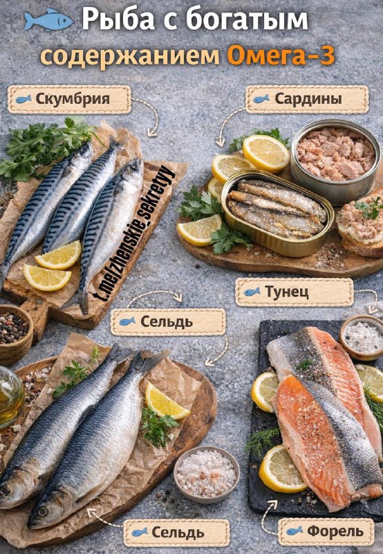Бюджетные виды рыб, которые содержат много полезных жирных кислот Омега-3. 1. Скумбрия ✔ Очень богатая Омега-3 (часто ≈ 2,5 – 4,5 г на 100 г) 2. Сардины (особенно консервированные) ✔ Одна из самых