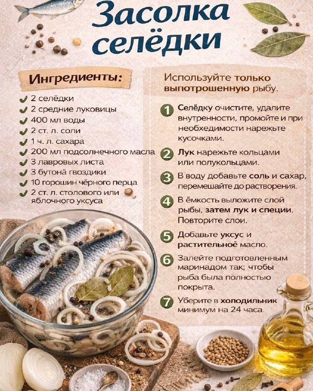Засолка селёдки. Ингредиенты: 2 селёдки 2 средние луковицы 400 мл воды 2 ст. л. соли 1 ч. л. сахара 200 мл подсолнечного масла 3 лавровых листа 3 бутона гвоздики 10 горошин чёрного перца 1 ч. л. кори