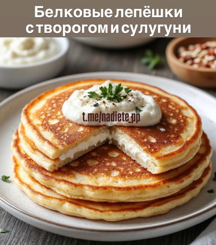 Белковые лепёшки с творогом и сулугуни Нежные, питательные, сытные — идеально на завтрак или перекус. 📝 Ингредиенты (на 4 лепёшки): Творог — 200 г (лучше мягкий, не зернистый) Сыр сулугуни — 100 г Я