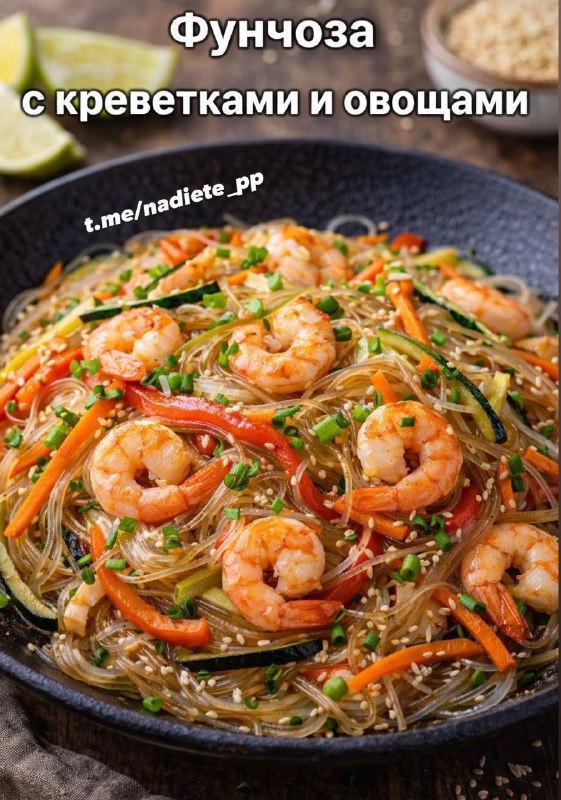 Фунчоза с креветками и овощами. Ингредиенты: Фунчоза (стеклянная лапша) — 200 г Креветки очищенные — 300 г Болгарский перец — 1 шт. Морковь — 1 шт. Кабачок или цукини — 1 небольшой Лук — 1 шт. Чеснок