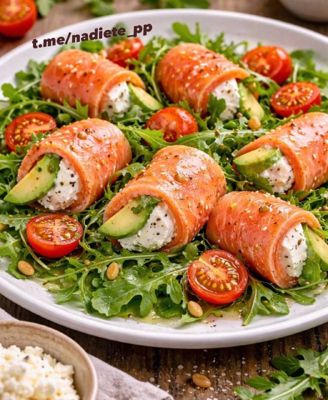 Салат с рукколой и лососем. Лёгкий, свежий и очень красивый салат — отлично подойдёт для ужина или праздничной подачи. Ингредиенты: Руккола — 1 пучок Авокадо — 1 шт. Помидоры черри — 8–10 шт. Творожн