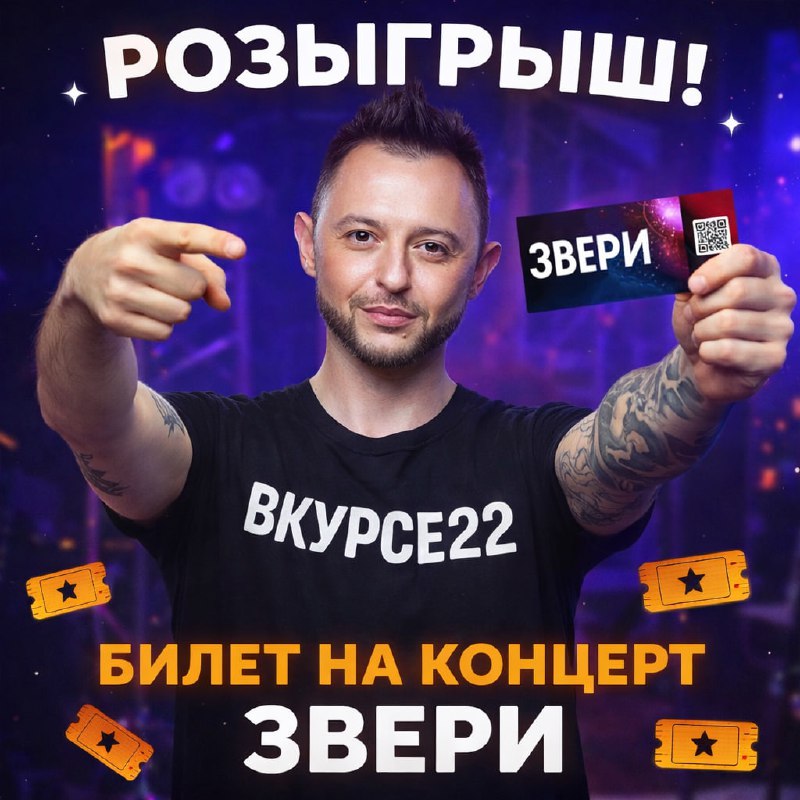 🎁 Дарим билет на концерт группы «ЗВЕРИ», который состоится в Барнауле. 📶 Условия: Быть нашим подписчиком: ⏩ @kudaGo22 и max.ru/vkurse22 ⏩Нажми кнопку "Участвовать" под этим постом ⠀ 👉 Победителя о